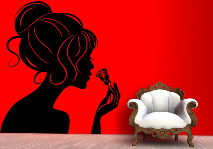 Autocolante da dama de rosa. Um elegante desenho que não passará despercibido para os seus convidados. Uma linda mulher de perfil cheirando uma bela rosa.