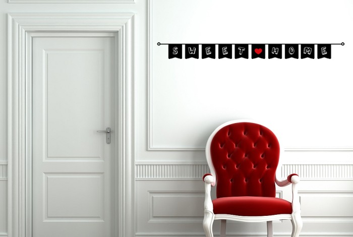 Simples e elegante adesivo de duas cores para decorar os eu lar, composição de bandeiras com o texto Sweet Home, separados por um coração central.