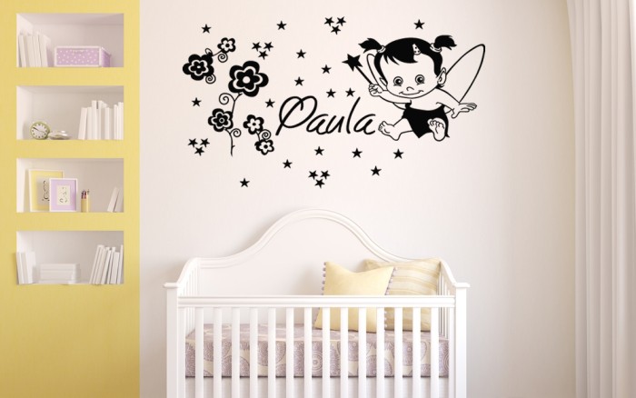 Autocolante decirativo de fadas com nome personalizado. Monstramos-lhe um divertido desenho duma pequena fada bebê com o nome da sua filha. Consiga o seu!
